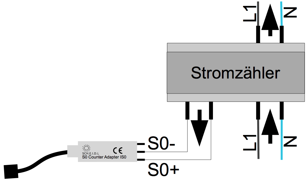 Verbindt de klemmen S0+ en S0- van de teller met die van de adapter.